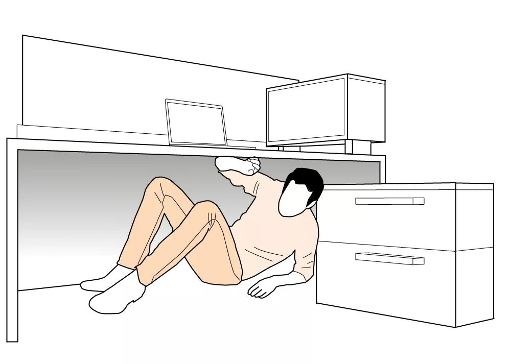 3.制定计划。不要只藏在桌子下死等。尽一切办法逃出去。同时做好枪手进入房间的准备。