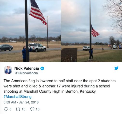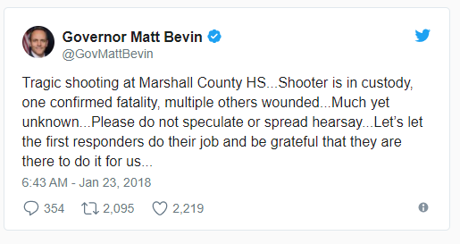 肯塔基州州长Matt Bevin,在推特上报告了今天早上发生在Marshall County高中的校园枪击案。