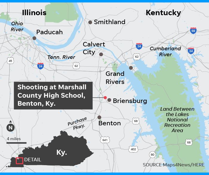 马歇尔县高中所在的 Benton 镇依然沉浸在震惊和哀痛中。