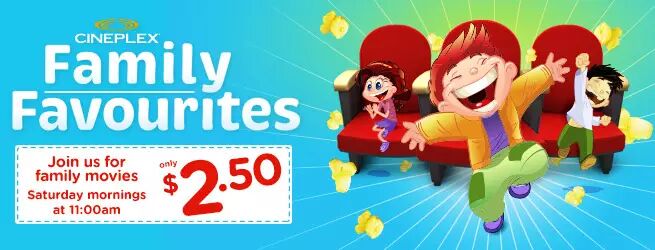 Cineplex 每周六上午11:00am, 和周三下五12:15pm 为大家准备了票价只有$2.5的家庭电影