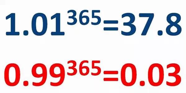 1.01=1+0.01,也就是每天进步一点。1.01的365次方也就是说你每天进步一点点,一年以后,你将进步很大,远远大于“1”