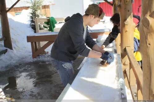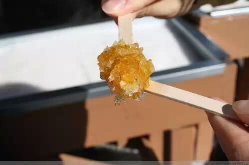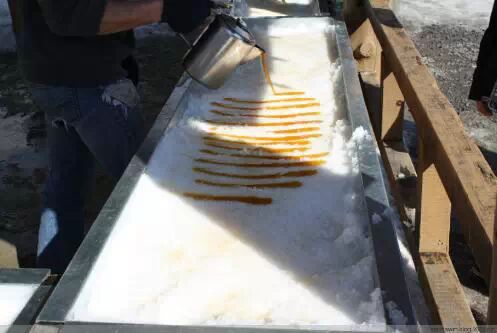 刚熬出来的枫糖,热气腾腾,香气扑鼻,刚淋在雪面上, 吃货们就一涌而上呢。。。