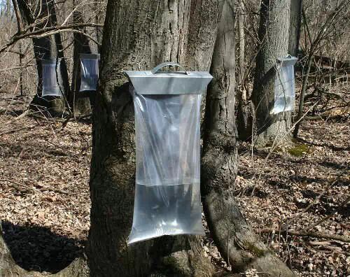 图中的袋子是现成买的"树液袋",大概能收集3加仑(11.4L)的枫树液。