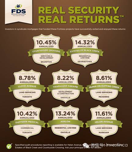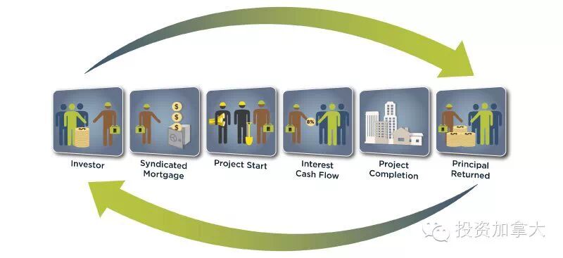 Mortgage本意为“抵押物”。作为Mortgage产品的一种,Syndicated Mortgage简单来说,和我们用房产作抵押从银行贷款(Residential Mortgage)相反,在这里,投资者扮演的是“银行”的角色。投资者通过获得物业或土地抵押来控制风险。每一位投资者都会获得律师签发的、个人拥有那一部分的土地登记证书。并且,在严格的法律监管下,投资者的资金只保存在信托公司里,地产开发商只有得到律师、会计师、工程监理等多方批准,才能获得信托公司的拨款,从而保证资金的安全。Syndicated Mortgage在加拿大是成熟的地产融资/投资产品。现金/现款、RRSP、TFSA等注册类资金均可投资。回报方式:固定利息8% + 项目结束后的分红。