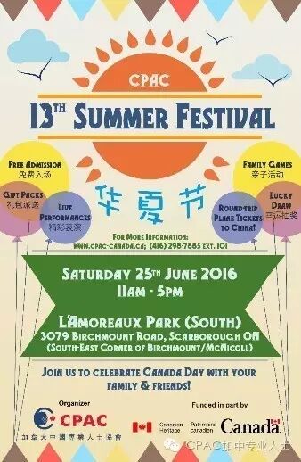 华人社区最大的户外狂欢节,由加拿大中国专业人士协会(CPAC)主办的华夏节又将在本月隆重登场!6月25日星期六带上您的家人和朋友, 来McNicoll夹Birchmount 的L’Amoreaux公园,吃喝玩乐、领礼品、赢中国往返机票,这是属于我们自己的年度大party!